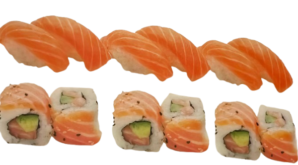 Soupe, salade et riz, 6 sushi (2 thon, 2 saumons, 2 daurade), 6 maki, 4 brochettes, 1boulettes de poulet, 1 poulet, 1ailes de poulet,2 boeuf au fromage